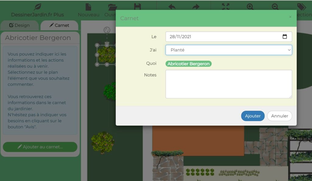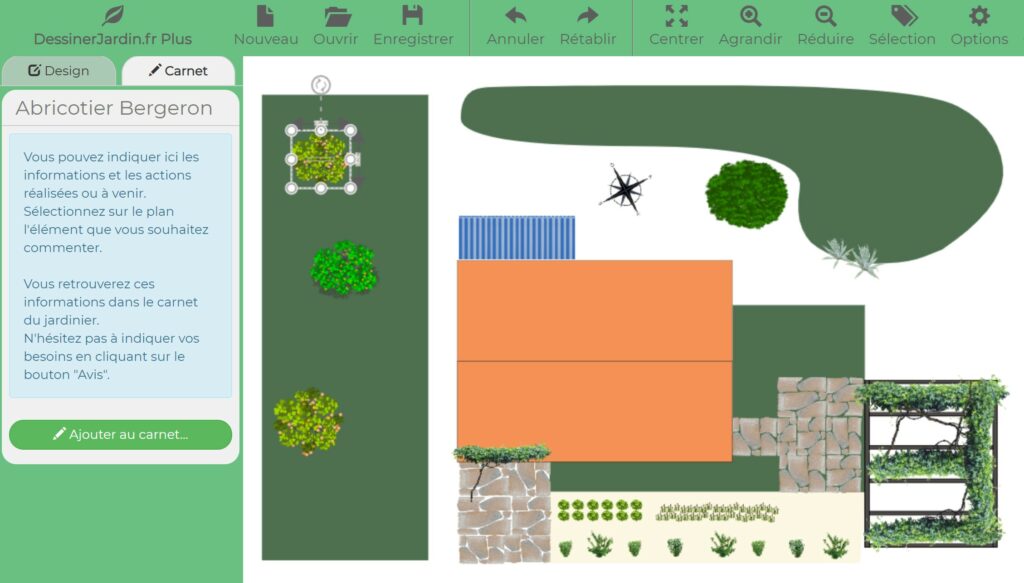 Vous pouvez consulter les informations élément par élément (arbre ou autre plantation). Pour cela, sélectionnez sur votre plan l'élément concerné et activez l'onglet carnet dans le menu de gauche.
